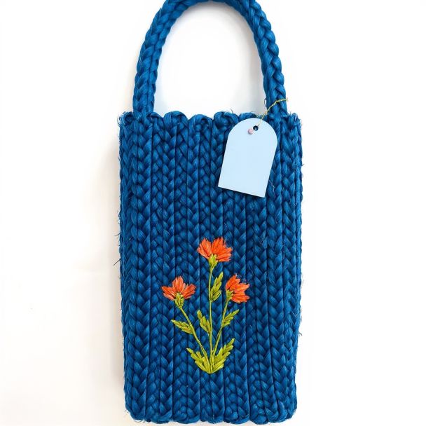 A tall carrier designed specifically to transport a water bottle, wine bottle, or reusable drink container. The braided handle allows for **hands-free carrying**.
