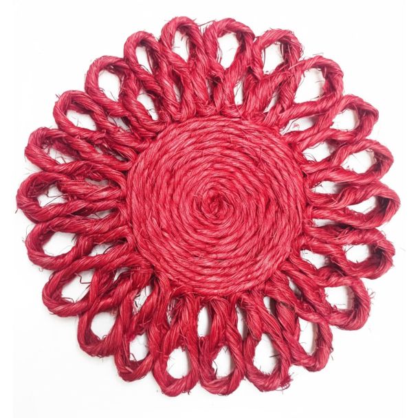 A bold, coiled flower-shaped trivet in vibrant red jute. Use it to safely place **hot casseroles and pots** on your table or as a festive centerpiece.